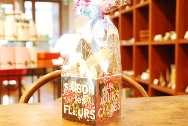 入っているお箱もオシャレな花柄で、いろんなリボンの色で仕上げています